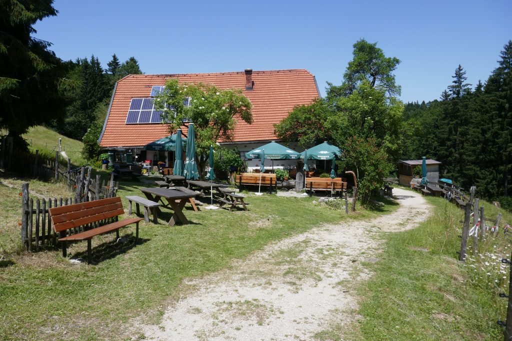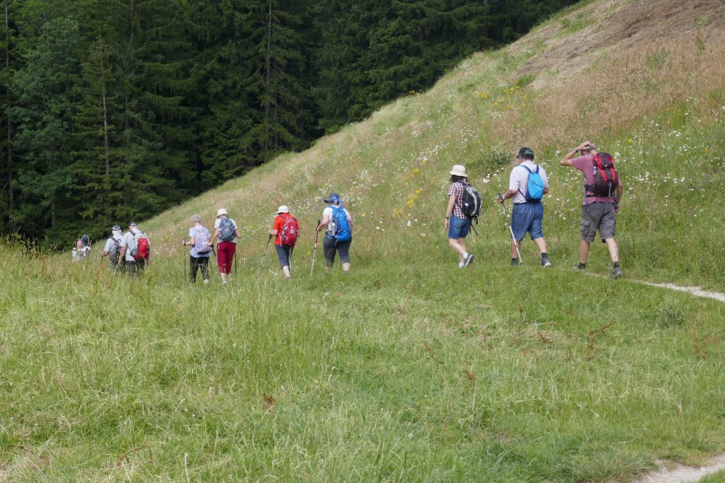 Abfahrt an der Linde um 08:45 Uhr. Der Gemeindebus mit neuem Fahrer (Klaus) und Toni mit seinem mehrsitzigen Fahrzeug, kutschieren uns sicher zum Parkplatz an der Hochplattenbahn (Marquartstein). Wir trotzen der ansteigenden Temperatur und dem ebenso gleich gut ansteigenden Weg neben der Lifttrasse. Mit selbiger Aufstiegshilfe ginge es sicher leichter nach oben, aber wir sind ja nicht zum Vergnügen unterwegs. Wir wollen doch was leisten. Zwei Drittel der Strecke sind zwar -zu unserer Freude- von Bäumen beschattet, trotzdem lassen die Hitzegrade unsere Schweißtropfen ganz ordentlich sprießen. Die „Rachlalm“, so verlockend sie sich auch anbietet, lassen wir rechts liegen. Ebenso an der einsamen „Hufnagelalm“ wandern wir vorbei. Nun aber ist es nicht mehr weit zu unserem Ziel. Leicht abwärts, durchs Gatter, erreichen wir die „Hefteralm“. Platz für uns alle ist gegeben und mit Nutzung der Selbstbedienung, findet ein Jeder eine passende Brotzeit und ein erfrischendes Getränk.